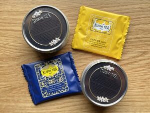 ティーバッグには植物由来(コーンスターチ使用)の素材が使われ、形は封筒型。紐はホッチキスや接着剤を使わず、熱処理で取り付けられています。タグには「KUSMI TEA」のロゴがデザインされていて、見た目もおしゃれですね。